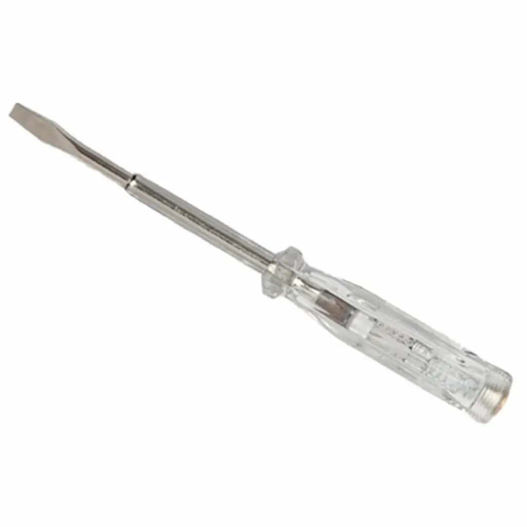 Chave de teste com detector de tensão 100 a 500V, lâmpada neon interna visível pelo cabo transparente em acrílico, haste em aço cromado e ponta fenda. Detecta presença de tensão em tomadas, fios, disjuntores e instalações elétricas com segurança e praticidade. Ferramenta essencial para eletricistas, instaladores e serralherios. Entrega para todo Minas Gerais.