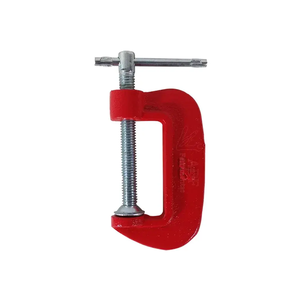 Grampo sargento tipo C em ferro fundido pintado vermelho, disponível em 3 tamanhos: 2″ (50mm), 4″ (100mm) e 6″ (150mm). Parafuso zincado com castanha giratória e haste T para aperto manual. Fixação firme e precisa para solda, serralheria, marcenaria e montagens em geral. Entrega para todo Minas Gerais.