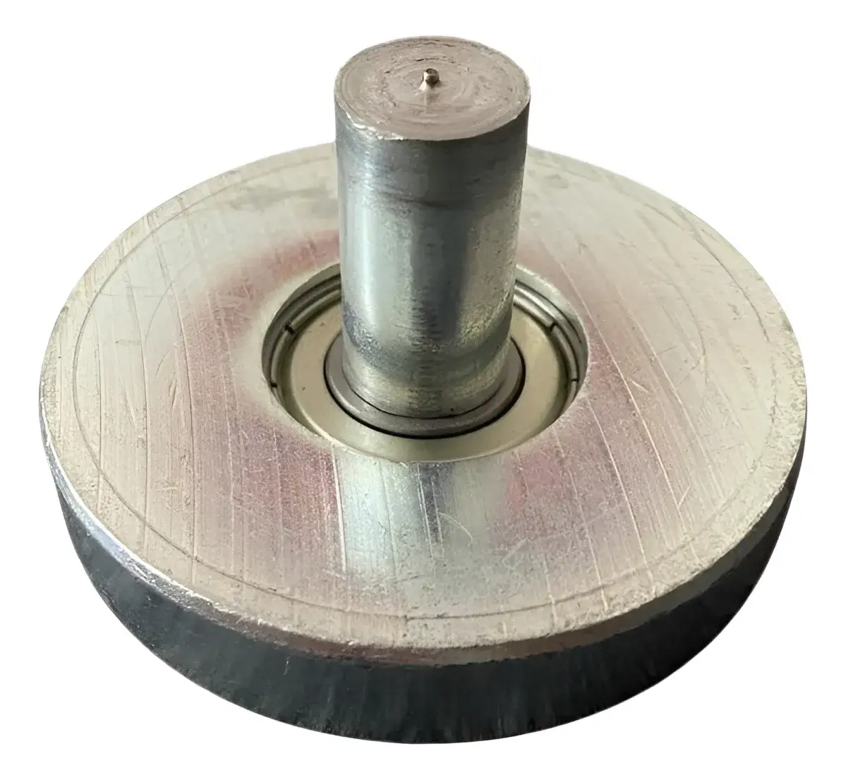 Guia em aço usinado com roda de 42mm de diâmetro e 25mm de espessura, rolamento de precisão e eixo cilíndrico padrão. Modelo versátil para portões deslizantes de médio porte em residências e comércios.