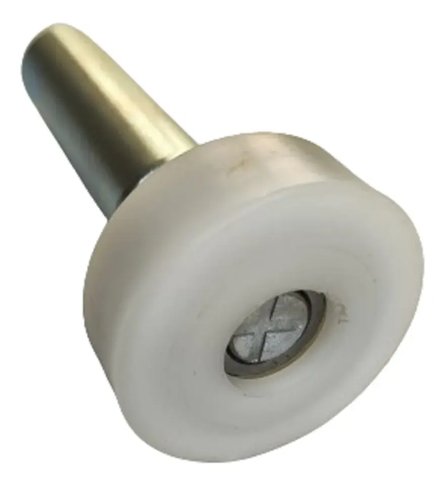 Guia com roda em nylon de alta resistência — operação completamente silenciosa, sem ruído metálico e sem risco de riscar trilhos de alumínio. Eixo em aço com rolamento de precisão. Escolha ideal para portões em residências e condomínios onde o silêncio é prioridade.